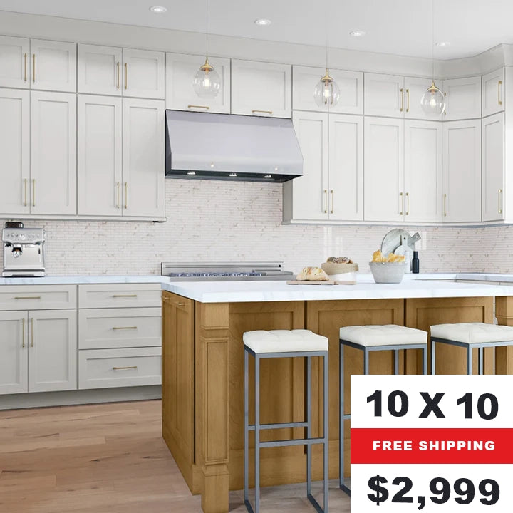 CabinetsHQ.com offers the Fusion line, a transitional kitchen cabinet collection that combines contemporary and traditional elements. Featuring wide rail moldings, distinctive detail, and a classic style, these cabinets boast full overlay doors, solid wood frames, and Blum soft-close technology, ensuring a stylish and functional addition to any kitchen design.
